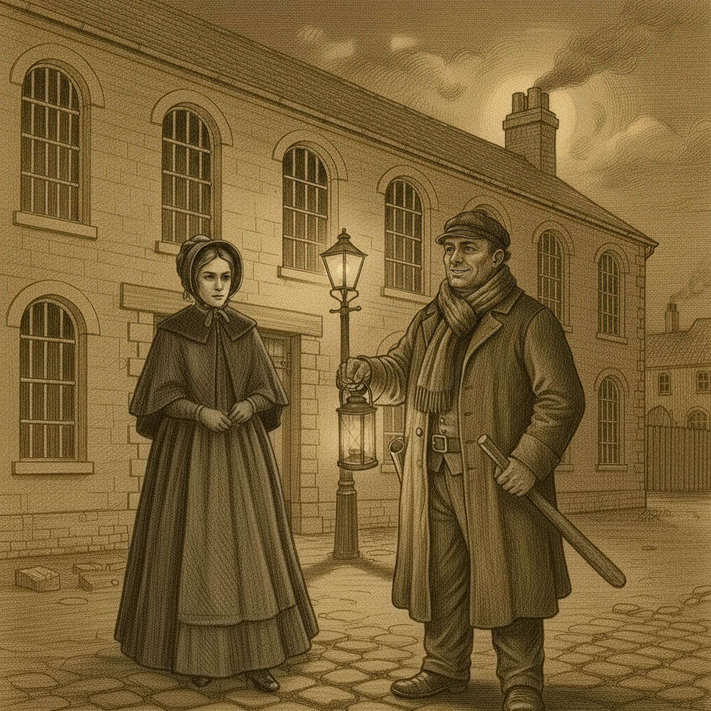 When he sees that it’s a woman, he chuckles, and she cajoles him, asking, “What kind of a night watchman are you, if a little woman can frighten you?”